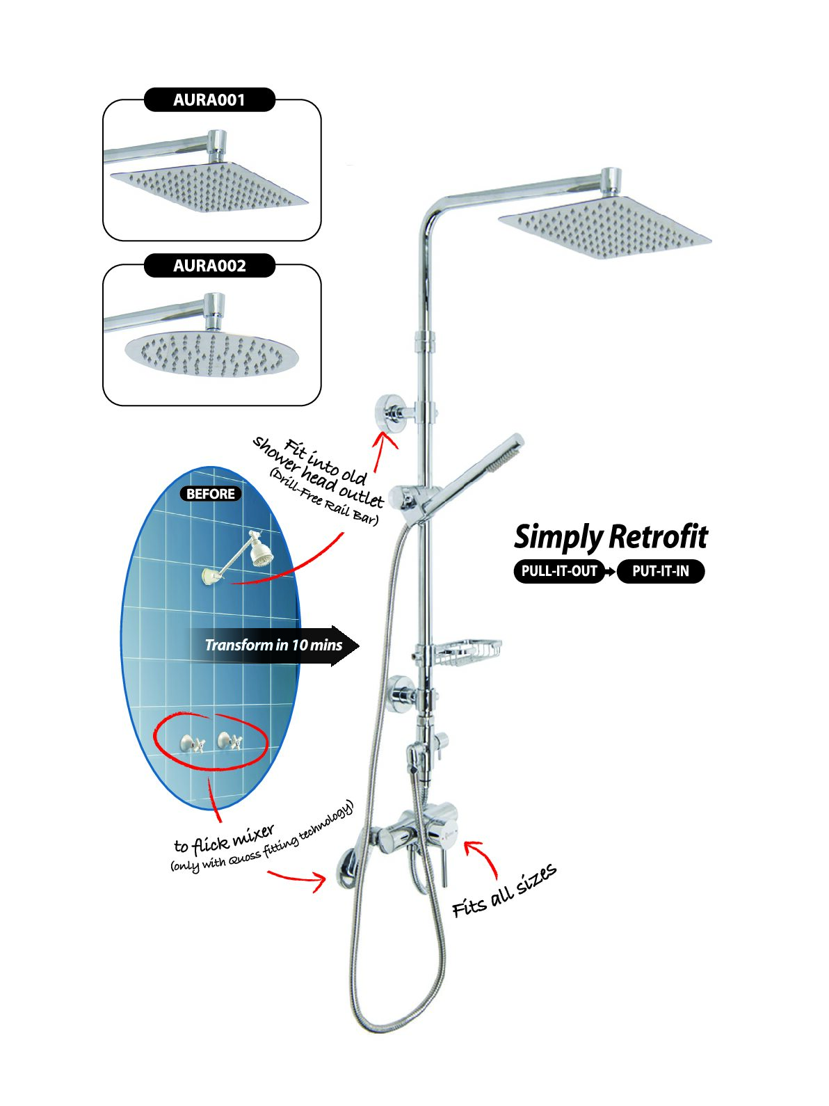 - Parts: Mixer, fittings, 1.5m flexible hose for handheld shower head, 40cm connection hose, drill-free/drill rail bar, overhead shower head (Rectangle: 200mm x 300mm) / Round: 250mm), handheld shower head, diverter switch