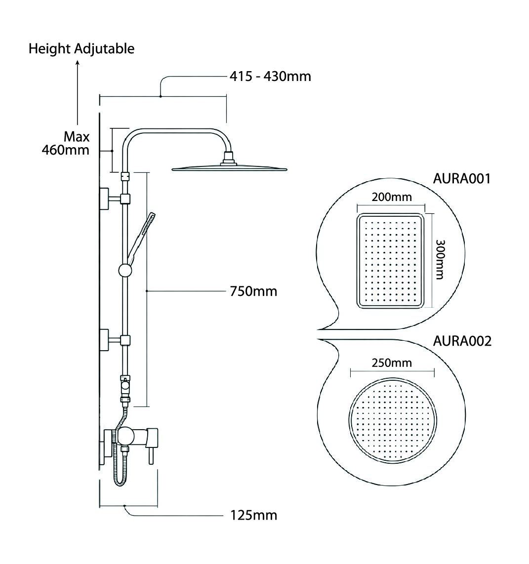 - Height adjustable overhead rain shower head (shape options: rectangle or round)